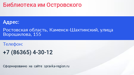 Библиотека им. Островского по адресу Ростовская область, Каменск-Шахтинский, улица Ворошилова, 155 в дальнейшем Организация, размещена в следующих категориях: