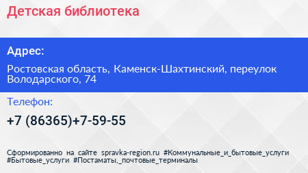 Детская библиотека по адресу Ростовская область, Каменск-Шахтинский, переулок Володарского, 74 в дальнейшем Организация, размещена в следующих категориях: