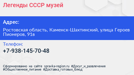 Легенды СССР, музей по адресу Ростовская область, Каменск-Шахтинский, улица Героев Пионеров, 91в в дальнейшем Организация, размещена в следующих категориях: