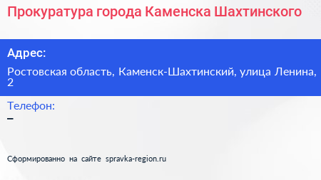 Прокуратура города Каменска-Шахтинского по адресу Ростовская область, Каменск-Шахтинский, улица Ленина, 2 в дальнейшем Организация, размещена в следующих категориях: