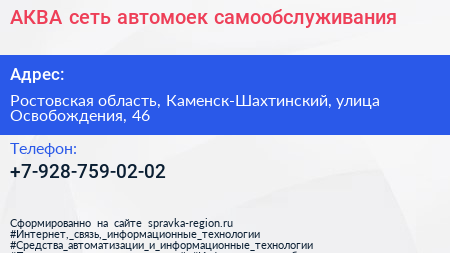 АКВА, сеть автомоек самообслуживания по адресу Ростовская область, Каменск-Шахтинский, улица Освобождения, 46 в дальнейшем Организация, размещена в следующих категориях: