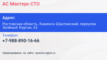 АС Мастерс, СТО по адресу Ростовская область, Каменск-Шахтинский, переулок Зелёный Курган, 61 в дальнейшем Организация, размещена в следующих категориях: