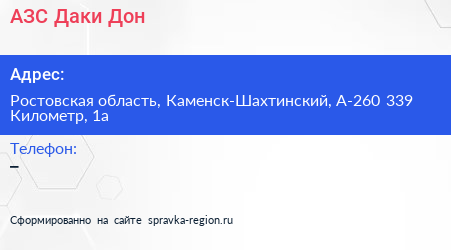 АЗС, Даки-Дон по адресу Ростовская область, Каменск-Шахтинский, А-260 339 Километр, 1а в дальнейшем Организация, размещена в следующих категориях: