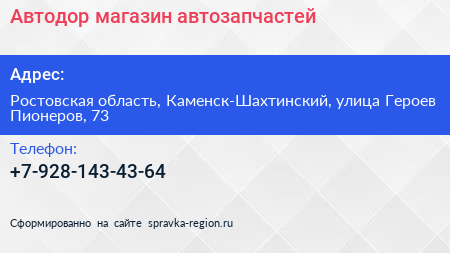 Автодор, магазин автозапчастей по адресу Ростовская область, Каменск-Шахтинский, улица Героев Пионеров, 73 в дальнейшем Организация, размещена в следующих категориях: