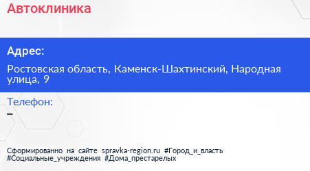 Автоклиника по адресу Ростовская область, Каменск-Шахтинский, Народная улица, 9 в дальнейшем Организация, размещена в следующих категориях: