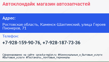 Автоклондайк, магазин автозапчастей по адресу Ростовская область, Каменск-Шахтинский, улица Героев Пионеров, 71 в дальнейшем Организация, размещена в следующих категориях: