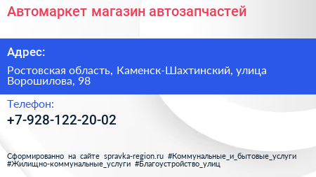 Автомаркет, магазин автозапчастей по адресу Ростовская область, Каменск-Шахтинский, улица Ворошилова, 98 в дальнейшем Организация, размещена в следующих категориях: