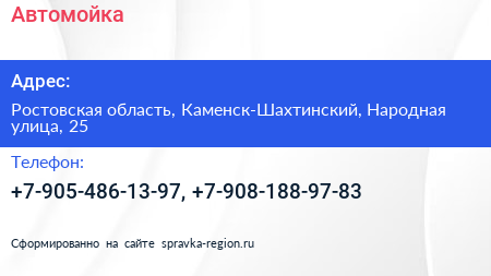 Автомойка по адресу Ростовская область, Каменск-Шахтинский, Народная улица, 25 в дальнейшем Организация, размещена в следующих категориях: