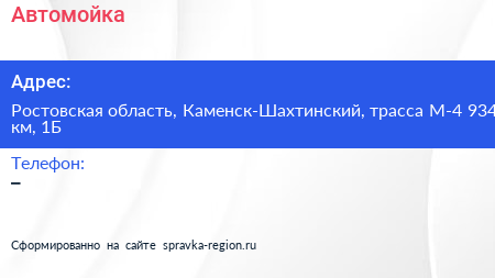 Автомойка по адресу Ростовская область, Каменск-Шахтинский, трасса М-4 934 км, 1Б в дальнейшем Организация, размещена в следующих категориях: