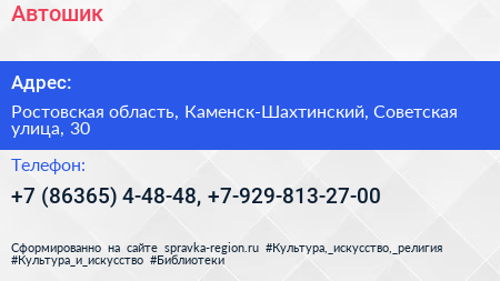 Автошик по адресу Ростовская область, Каменск-Шахтинский, Советская улица, 30 в дальнейшем Организация, размещена в следующих категориях: