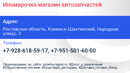 Иномарочка, магазин автозапчастей по адресу Ростовская область, Каменск-Шахтинский, Народная улица, 3 в дальнейшем Организация, размещена в следующих категориях: