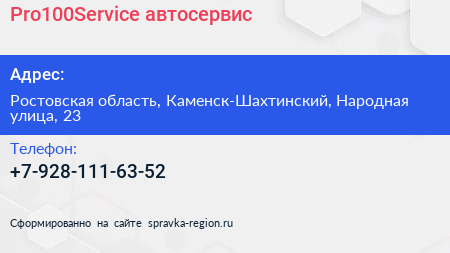 Pro100Service, автосервис по адресу Ростовская область, Каменск-Шахтинский, Народная улица, 23 в дальнейшем Организация, размещена в следующих категориях: