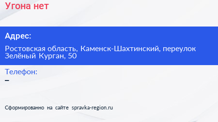 Угона.нет по адресу Ростовская область, Каменск-Шахтинский, переулок Зелёный Курган, 50 в дальнейшем Организация, размещена в следующих категориях: