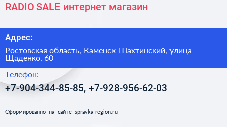 RADIO-SALE, интернет магазин по адресу Ростовская область, Каменск-Шахтинский, улица Щаденко, 60 в дальнейшем Организация, размещена в следующих категориях: