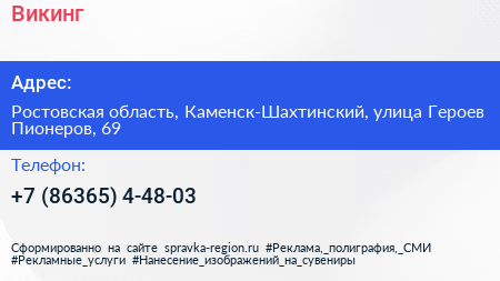 Викинг по адресу Ростовская область, Каменск-Шахтинский, улица Героев Пионеров, 69 в дальнейшем Организация, размещена в следующих категориях:
