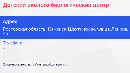 Детский эколого-биологический центр по адресу Ростовская область, Каменск-Шахтинский, улица Ленина, 45 в дальнейшем Организация, размещена в следующих категориях: