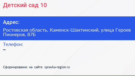 Детский сад №10 по адресу Ростовская область, Каменск-Шахтинский, улица Героев Пионеров, 87Б в дальнейшем Организация, размещена в следующих категориях: