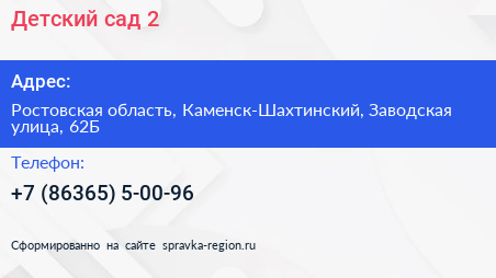Детский сад №2 по адресу Ростовская область, Каменск-Шахтинский, Заводская улица, 62Б в дальнейшем Организация, размещена в следующих категориях: