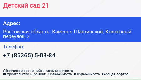 Детский сад №21 по адресу Ростовская область, Каменск-Шахтинский, Колхозный переулок, 2 в дальнейшем Организация, размещена в следующих категориях: