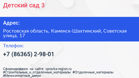 Детский сад №3 по адресу Ростовская область, Каменск-Шахтинский, Советская улица, 17 в дальнейшем Организация, размещена в следующих категориях: