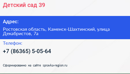Детский сад №39 по адресу Ростовская область, Каменск-Шахтинский, улица Декабристов, 7а в дальнейшем Организация, размещена в следующих категориях: