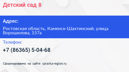 Детский сад №8 по адресу Ростовская область, Каменск-Шахтинский, улица Ворошилова, 157а в дальнейшем Организация, размещена в следующих категориях: