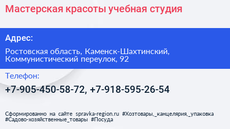Мастерская красоты, учебная студия по адресу Ростовская область, Каменск-Шахтинский, Коммунистический переулок, 92 в дальнейшем Организация, размещена в следующих категориях: