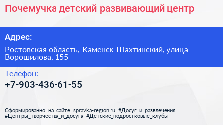 Почемучка, детский развивающий центр по адресу Ростовская область, Каменск-Шахтинский, улица Ворошилова, 155 в дальнейшем Организация, размещена в следующих категориях: