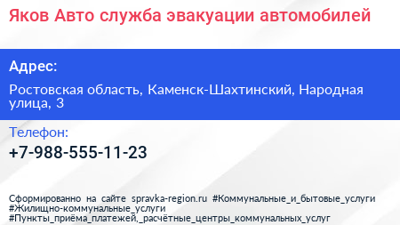 Яков Авто, служба эвакуации автомобилей по адресу Ростовская область, Каменск-Шахтинский, Народная улица, 3 в дальнейшем Организация, размещена в следующих категориях: