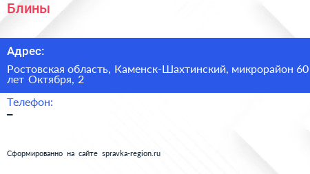 Блины по адресу Ростовская область, Каменск-Шахтинский, микрорайон 60 лет Октября, 2 в дальнейшем Организация, размещена в следующих категориях: