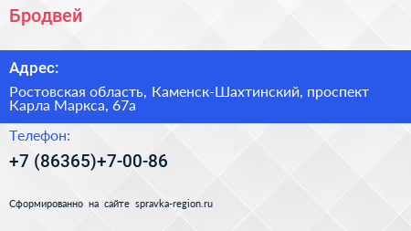 Бродвей по адресу Ростовская область, Каменск-Шахтинский, проспект Карла Маркса, 67а в дальнейшем Организация, размещена в следующих категориях: