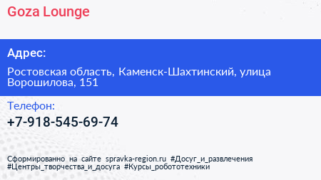 Goza Lounge по адресу Ростовская область, Каменск-Шахтинский, улица Ворошилова, 151 в дальнейшем Организация, размещена в следующих категориях: