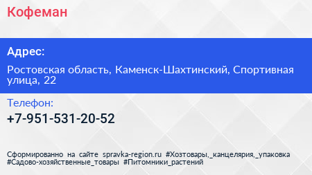 Кофеман по адресу Ростовская область, Каменск-Шахтинский, Спортивная улица, 22 в дальнейшем Организация, размещена в следующих категориях: