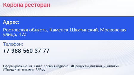 Корона, ресторан по адресу Ростовская область, Каменск-Шахтинский, Московская улица, 47а в дальнейшем Организация, размещена в следующих категориях: