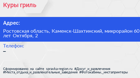 Куры-гриль по адресу Ростовская область, Каменск-Шахтинский, микрорайон 60 лет Октября, 2 в дальнейшем Организация, размещена в следующих категориях: