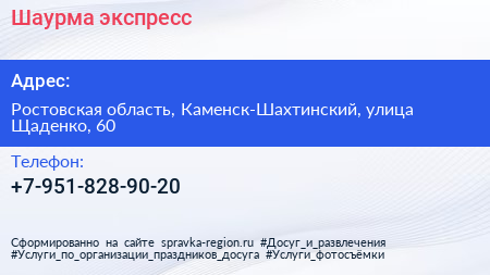 Шаурма-экспресс по адресу Ростовская область, Каменск-Шахтинский, улица Щаденко, 60 в дальнейшем Организация, размещена в следующих категориях:
