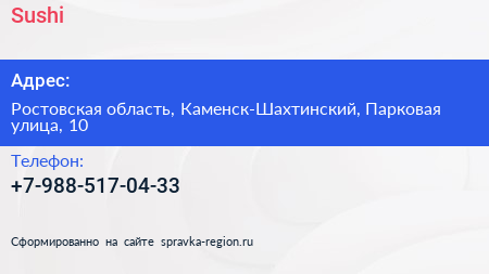 Sushi по адресу Ростовская область, Каменск-Шахтинский, Парковая улица, 10 в дальнейшем Организация, размещена в следующих категориях: