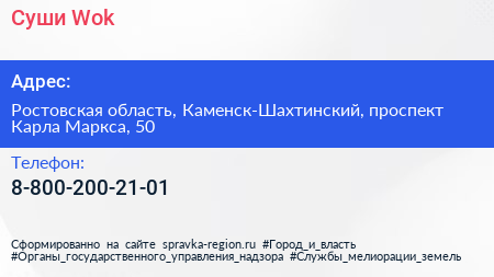 Суши Wok по адресу Ростовская область, Каменск-Шахтинский, проспект Карла Маркса, 50 в дальнейшем Организация, размещена в следующих категориях: