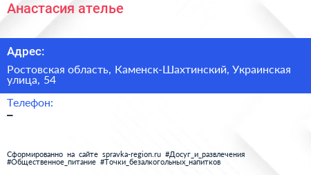 Анастасия, ателье по адресу Ростовская область, Каменск-Шахтинский, Украинская улица, 54 в дальнейшем Организация, размещена в следующих категориях: