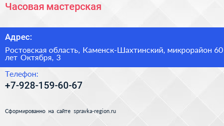 Часовая мастерская по адресу Ростовская область, Каменск-Шахтинский, микрорайон 60 лет Октября, 3 в дальнейшем Организация, размещена в следующих категориях: