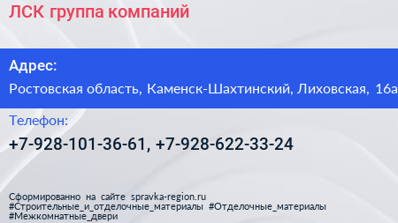 ЛСК, группа компаний по адресу Ростовская область, Каменск-Шахтинский, Лиховская, 16а в дальнейшем Организация, размещена в следующих категориях: