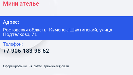 Мини-ателье по адресу Ростовская область, Каменск-Шахтинский, улица Подтелкова, 71 в дальнейшем Организация, размещена в следующих категориях:
