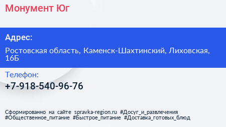 Монумент Юг по адресу Ростовская область, Каменск-Шахтинский, Лиховская, 16Б в дальнейшем Организация, размещена в следующих категориях: