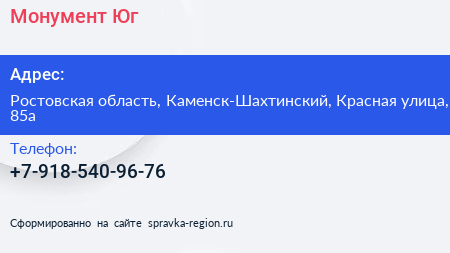 Монумент Юг по адресу Ростовская область, Каменск-Шахтинский, Красная улица, 85а в дальнейшем Организация, размещена в следующих категориях: