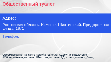 Общественный туалет по адресу Ростовская область, Каменск-Шахтинский, Придорожная улица, 18/1 в дальнейшем Организация, размещена в следующих категориях: