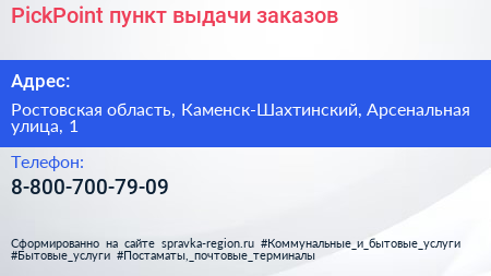 PickPoint, пункт выдачи заказов по адресу Ростовская область, Каменск-Шахтинский, Арсенальная улица, 1 в дальнейшем Организация, размещена в следующих категориях: