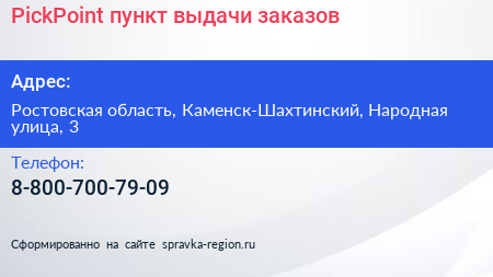 PickPoint, пункт выдачи заказов по адресу Ростовская область, Каменск-Шахтинский, Народная улица, 3 в дальнейшем Организация, размещена в следующих категориях: