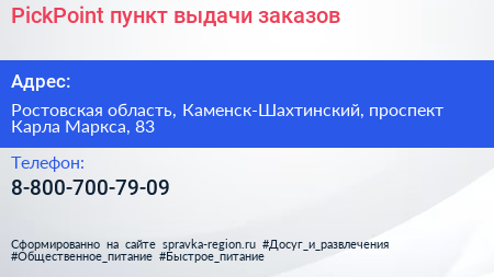 PickPoint, пункт выдачи заказов по адресу Ростовская область, Каменск-Шахтинский, проспект Карла Маркса, 83 в дальнейшем Организация, размещена в следующих категориях: