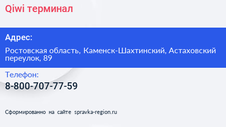 Qiwi, терминал по адресу Ростовская область, Каменск-Шахтинский, Астаховский переулок, 89 в дальнейшем Организация, размещена в следующих категориях: