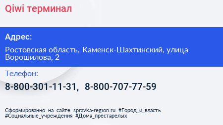 Qiwi, терминал по адресу Ростовская область, Каменск-Шахтинский, улица Ворошилова, 2 в дальнейшем Организация, размещена в следующих категориях: